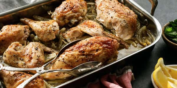يجهّز البصل شرائح والجزر وتُرتب في قاعدة صينية الفرن، ثم توضع الدجاجة فوقها. يضاف كوب ماء أو مرق دجاج إلى الصينية لإعطاء رطوبة ونكهة غنية أثناء الطهي. إذا رغبت، تُضاف بطاطس مقطعة مكعبات إلى الصينية كطبق جانبي. يُسخّن الفرن إلى 200 مئوية، وتُغطّى الصينية بورق فويل وتُدخل الفرن لمدة 45 دقيقة.