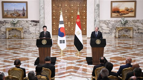 ألقى الرئيس المصري كلمة خلال المؤتمر الصحفي المشترك شدد فيها على ترحيب مصر بالرئيس لي وبأن العلاقات بين البلدين تمر بمرحلة تطور تدفعها ثلاثة عقود من التعاون، وتوصيفها بأنها جسر حضاري واقتصادي وتعاوني. أشار إلى أهمية اتخاذ خطوات تنفيذية لتدشين مزيد من التعاون في المجالات الاقتصادية والتكنولوجية والابتكار، ودعا الشركات الكورية إلى توسيع حضورها واستثماراتها في مصر. وتطرق إلى مقترحات مثل إنشاء جامعة كورية متخصصة في العلوم والتكنولوجيا في مصر، ودراسة إمكانية إنشاء مدارس كورية، إضافة إلى توقيع مذكرتي تفاهم في الثقافة والتعليم. ختم بالتأكيد على استمرار التعاون وتقديم التسهيلات للشركات الكورية والقطاعات الاقتصادية المختلفة للاستفادة من الحوافز الحكومية المصرية وتطوير الشراكات.