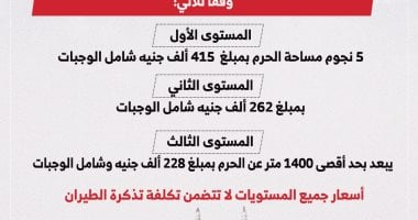 أعلنت وزارة التضامن الاجتماعي عن أسعار برامج الحج لموسم 1447هـ- 2026م وفقًا لما أعلنته اللجنة العليا للحج. المستوى الأول 5 نجوم بساحة الحرم يبلغ 415 ألف جنيه شامل الوجبات. المستوى الثاني يبلغ 262 ألف جنيه شامل الوجبات. المستوى الثالث يبلغ 228 ألف جنيه وشامل الوجبات.
