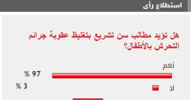 أعلنت جهة إعلامية نتائج استفتاء أُجري هذا الشهر على قرائها حول مطلب سن تشريع بتغليظ عقوبة جرائم التحرش بالأطفال. طرح الاستفتاء السؤال: هل تؤيد مطالب سن تشريع بتغليظ العقوبة على هذه الجرائم؟ أظهرت النتائج أن غالبية القراء أيدت المطالب، حيث بلغت نسبة المؤيدين 97% بينما عارضها 3% فقط.