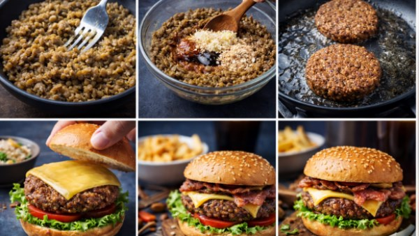 يُسلق العدس حتى ينضج جيدًا ثم يُصفّى. يُهرس العدس جيدًا في وعاء كبير ليصبح شبه عجينة. يُضاف إليه الشوفان والبصل والثوم والتوابل وصلصة الصويا ويُخلَط المزيج جيدًا حتى يتجانس. يُشكّل المزيج على هيئة برغر بالحجم المرغوب. يُسخّن قليل من زيت الزيتون في مقلاة على نار متوسطة، ثم يُقلى البرغر لمدة 3–4 دقائق على كل جانب حتى يتحمر.