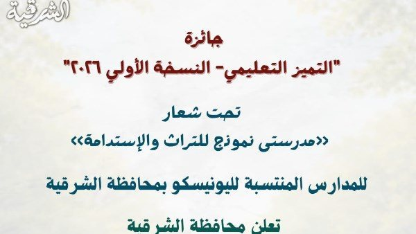 أعلن محافظ الشرقية إطلاق النسخة الأولى من مسابقة التميز التعليمي لعام ٢٠٢٦ تحت شعار «مدرستي نموذج للتراث والاستدامة» المخصصة للمدارس المنتسبة لليونسكو في المحافظة. وتجري المسابقة تحت إشراف الهيئة الإقليمية لتنشيط السياحة بالشرقية وبالتعاون مع وحدة اليونسكو بالمحافظة. وتأتي هذه المبادرة تزامنًا مع الاحتفال باليوم العالمي للتعليم الموافق ٢٤ يناير من كل عام.