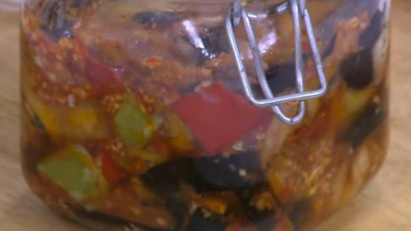يجمع الطاهي الثوم مع مزيج الباذنجان والفلفل الحار حتى تتجانس النكهات. يضع الطاهي المزيج في برطمان نظيف وجاف ويخزنه في الثلاجة ليستخدم عند الحاجة. يترك الطاهي الخليط لبضعة أيام قبل الاستخدام لتعزيز النكهات وتكاملها حتى يصبح الباذنجان المخلل جاهزاً للاستخدام.