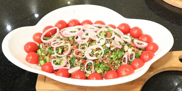 تتبع الوصفة خطوات بسيطة لإعداد سلطة عدس من خلال خلط العدس المطبوخ مع مكونات مناسبة أخرى. تُنقل المكوّنات المتجانسة إلى طبق التقديم وتُزَّين بقطع جبنة براميلي ناشفة وتُقدم مع الخبز البلدي. تتميز الوصفة بسهولة تنفيذها وتناسب السحور وتضيف قيمة غذائية للوجبة.