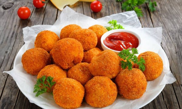 تُقلى كرات البطاطس في زيت ساخن حتى تتحول إلى اللون الذهبي الشهي. تُرفع من الزيت وتُرش بقليل من الملح وتقدم ساخنة مع البقدونس المفروم كزينة. يُفضل تقديمها مع صلصة مناسبة أو كتشب حسب الرغبة لتكتمل الوجبة.