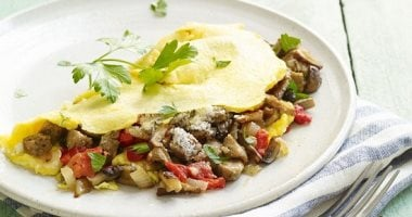 المكونات المطلوبة تشمل ثلاث حبات بيض، 150 جرام سجق مقطع حلقات، نصف حبة فلفل ألوان مقطعة مكعبات، نصف حبة بصل مفروم، ربع حبة جزر مبشور، ملعقة كبيرة زيت زيتون، نصف ملعقة صغيرة ملح، ربع ملعقة صغيرة فلفل أسود، وملعقة كبيرة بقدونس مفروم للتزيين. يسخن الزيت في مقلاة على نار متوسطة ثم يضاف البصل ويقلب حتى يذبل، ثم يضاف السجق ويقلب حتى يتغير لونه ويقترب من النضج. تضاف مكعبات الفلفل والجزر وتُخلط المكونات معًا لمدة دقيقتين، ثم يخفق البيض مع الملح والفلفل الأسود ويسكب فوق خليط السجق والخضار، ثم يوضع الخليط في قالب فرن ويترك حتى يتماسك، وأخيرًا يرفع من الفرن ويُزين بالبقدونس ويُقدم ساخنًا.