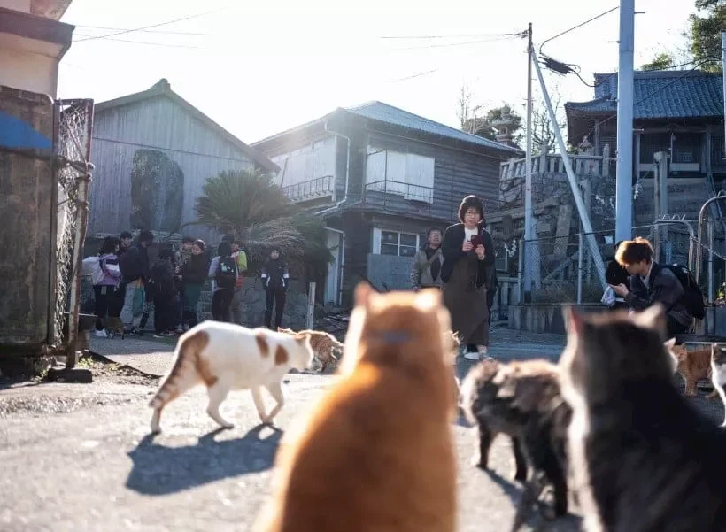 تعيش قطط الجزيرة حياة فريدة، وتحظى برعاية خاصة من قبل سكانها الذين يعتبرونها مصدر بركة وسعادة. تعود بداية وجود القطط في الجزيرة إلى عصر إيدو (1600-1868)، حين جُلبت حوالي 200 قطة برية لمكافحة الفئران التي كانت تهدد صناعة دودة القز، التي كانت مهمة لإنتاج الحرير. مع تحول الصيد لمهنة أساسية للسكان، استفادت القطط من كثرة الأسماك المتوفرة، فزادت تغذيتها بشكل ملحوظ. يتحلى السكان بالحرص على تغذية القطط من خلال محطات مخصصة، ويُطلب من الزوار الامتناع عن إطعامها وجبات خفيفة، حسب ما ذكرته تقارير إعلامية.