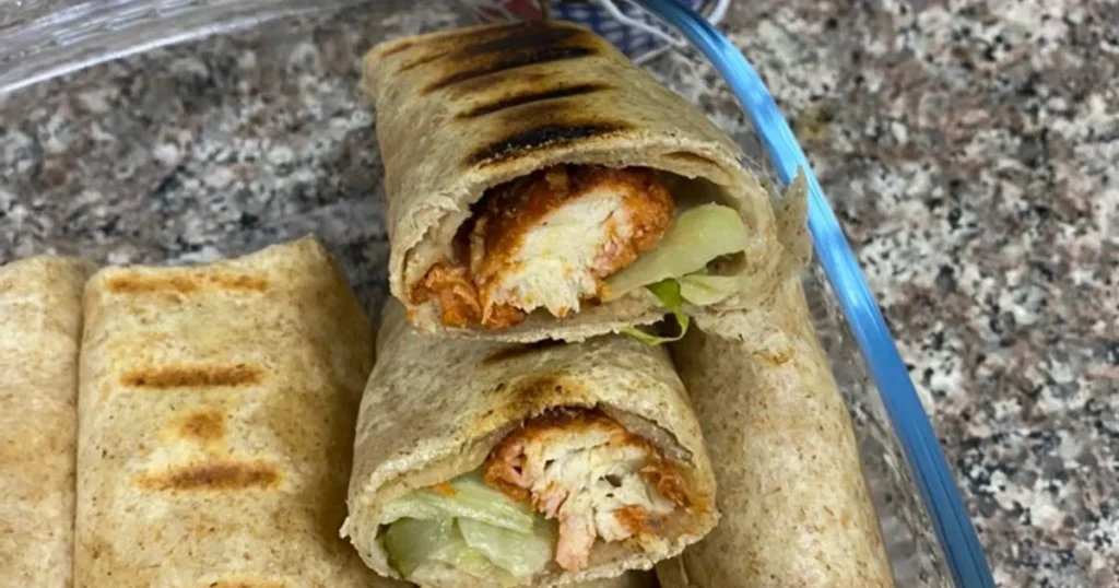 ضع شرائح الدجاج المطهوة فوق التورتيلا وأضف شرائح خس وطماطم وخيار أو أي خضار تفضّلها، أضف صوص مايونيز أو رانش أو ثومية ثم لف الراب بإحكام.
