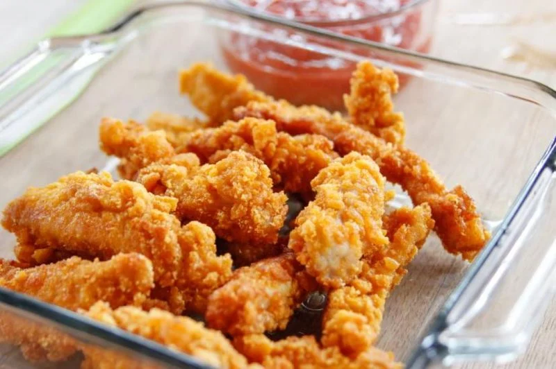 ضعي 500 جرام صدور دجاج مقطعة شرائح (ستريبس) في وعاء وأضيفي كوب لبن وملعقة كبيرة خل أبيض أو عصير ليمون، ثم تبّليها بملح وفلفل أسود وملعقة صغيرة بابريكا ونصف ملعقة صغيرة شطة ونصف ملعقة صغيرة ثوم بودرة ونصف ملعقة صغيرة بصل بودرة ونصف ملعقة صغيرة زعتر أو أوريجانو اختياري وملعقة صغيرة صوص حار اختياري.