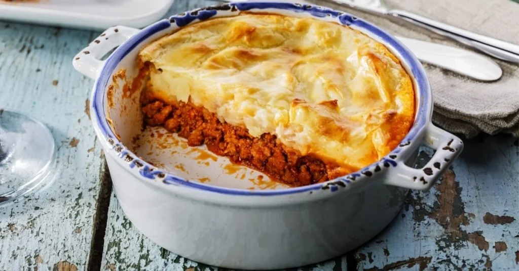 4 حبات بطاطس كبيرة، 300 جرام لحم مفروم، بصلة متوسطة مفرومة ناعماً، 2 فص ثوم مفروم، 2 ملعقة كبيرة زيت زيتون أو نباتي، 1 ملعقة صغيرة بهارات مشكلة، 1/2 ملعقة صغيرة قرفة اختياري، ملح وفلفل أسود حسب الرغبة، 1/2 كوب صلصة طماطم أو معجون مخفف بالماء، 1/4 كوب بقدونس مفروم اختياري، جبنة موتزاريلا أو شيدر مبشورة اختياري للوجه، 1 كوب لبن زبادي اختياري.