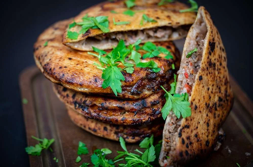 قطعي الخبز البلدي (عيش بلدي أو خبز صاج) إلى نصفين وافرغي من الداخل قليلًا لتشكيل جيب، املئي جيوب الخبز بخليط اللحم بشكل متساوٍ.