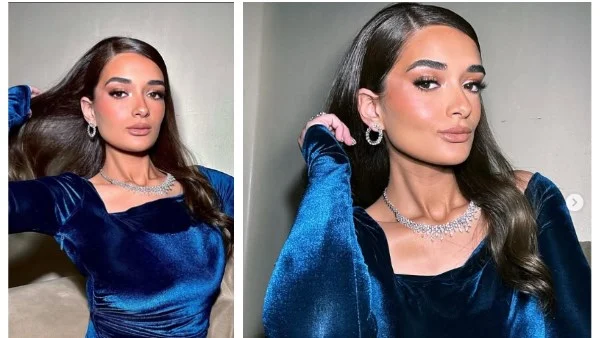 تركت شعرها البني الطويل منسدلاً بين كتفيها بأسلوب ناعم وجذاب يتناسب مع إطلالتها.