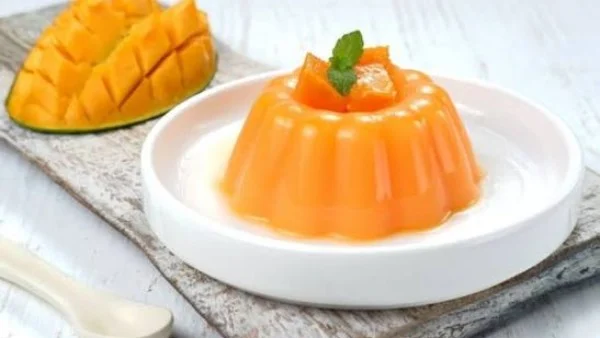 استخدم المقادير التالية: 2 كوب عصير مانجو، 5 ملاعق كبيرة جيلاتين، 1 كوب مكعبات مانجو صغيرة، 1 ونصف كوب زبادي يوناني لايت، فانيليا، 2 ملعقة كبيرة جوز هند مبشور.