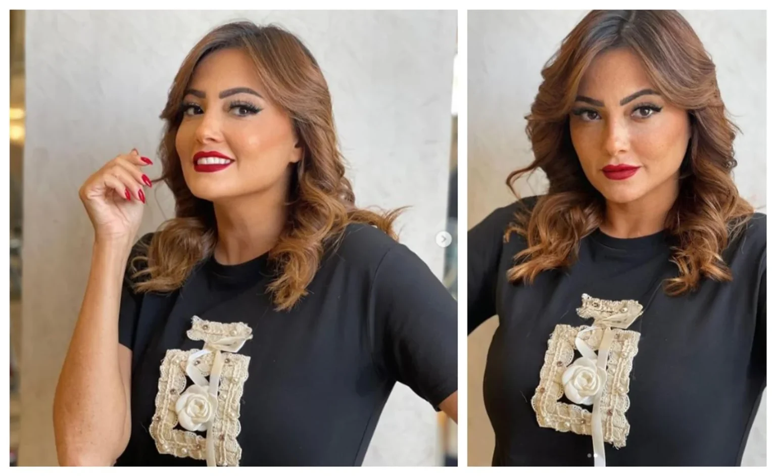 تركت شعرها البني القصير منسدلاً على كتفيها بشكل ناعم وجذاب يتناغم مع الإطلالة.