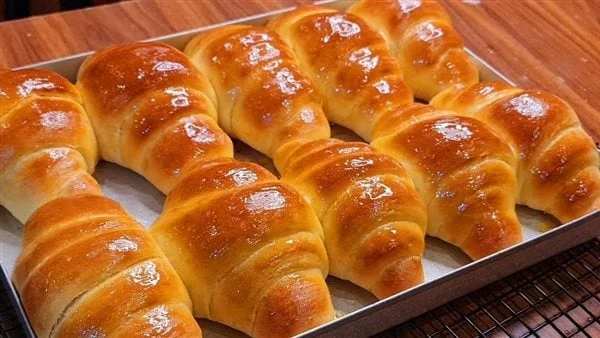 تُرص الكرواسونات في صينية مدهونة، وتُترك لمدة 20 دقيقة حتى ترتاح.