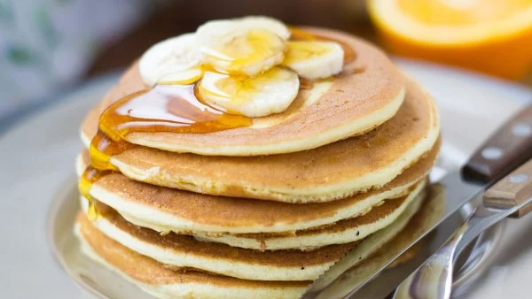المكونات اللازمة: كوب حليب سائل، كوب دقيق، 2 ملعقة كبيرة سكر، 1 ملعقة كبيرة زيت نباتي، 2 بيضة، 2 موزة مهروسة، 1 ملعقة كبيرة بايكينغ باودر، رشة ملح.