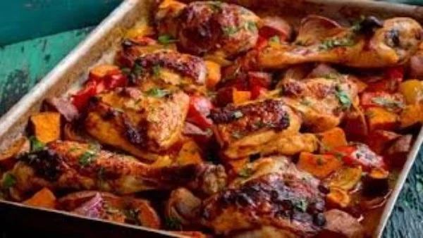 تبيّن الوصفة كيف تُتبّل الدجاج بمزيج من الملح والفلفل الأسود والبابريكا والكركم وعصير نصف ليمونة، مع الثوم المفروم. وتترك الوصفة قطع الدجاج في التتبيلة لمدة 30 دقيقة لتتشرب النكهات جيدًا. وتُؤكد الوصفة توزيع التتبيلة بشكل متساوٍ على كل القطع قبل الانتقال إلى ترتيب الخضار. وتحرص الوصفة على تغطية الدجاج خلال مرحلة التتبيل للحفاظ على الرطوبة.