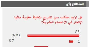 طرح موقع إلكتروني سؤالاً على قرائه بتاريخ 11 أكتوبر 2025 حول مدى تأييدهم لمطالب سنّ تشريع بتغليظ عقوبة مافيا الاتجار في الأعضاء البشرية. يهدف السؤال إلى معرفة موقف الجمهور من تشديد العقوبات وتحديد الجهات التي تقف وراء هذه المطالب. أظهر التفاعل أن غالبية القراء أيدوا المطالب، بينما عبر عدد من القراء عن رفضهم. حيث بلغت نسبة المؤيدين 93% مقابل 7% معارضين.