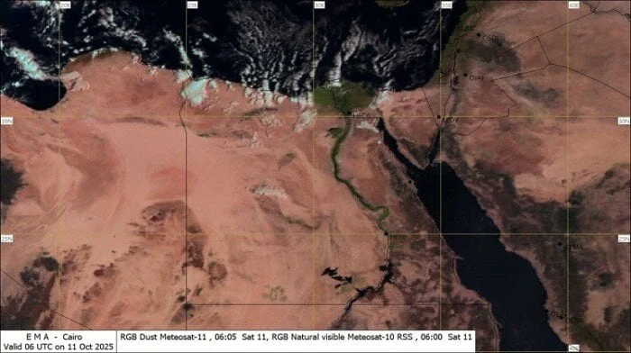 تعلن الهيئة العامة للأرصاد الجوية حالة الطقس اليوم السبت 11 أكتوبر 2025 في المدن والمحافظات المصرية، وتوضح سيطرة أجواء خريفية على أنحاء البلاد مع سحب منخفضة تزين سماء القاهرة الكبرى وشمال البلاد وترافقها نشاط نسبى للرياح يساهم في تلطيف الأجواء. وتشير صور الأقمار الصناعية إلى استمرار تكاثر السحب المنخفضة والمتوسطة على مناطق متفرقة من السواحل الشمالية وشمال الوجه البحري، مع فرص لسقوط أمطار خفيفة على بعض المناطق. وتظل الأمطار متقطعة وغير مؤثرة على الأنشطة اليومية في المناطق الساحلية، بينما يلاحظ وجود سحب وتوقعات لطقس مائل للحرارة في أجزاء من البلاد خلال اليوم. كما يرافق حالة الجو وجود نشاط رياح محلي على مناطق متفرقة من القاهرة الكبرى والسواحل الشمالية الغربية وجنوب سيناء وشمال الصعيد إضافة إلى محافظة الوادي الجديد، ما قد ينعكس على انخفاض طفيف في درجات الحرارة خلال فترات متأخرة من اليوم.