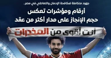 وأشارت الإنفوجرافات إلى أن مكتب الأمم المتحدة المعني بالمخدرات والجريمة UNODC أقر بأن مصر هي أول دولة تطبق مبادرة CHAMPS لتعزيز أنظمة الوقاية للأطفال حتى سن المراهقة. وتؤكد المبادرة التزام الدولة بتوفير حماية الأطفال والمراهقين من مخاطر الإدمان. وتأتي هذه الخطوة ضمن إطار التعاون الدولي لتعزيز الوقاية وتقييم المخاطر.