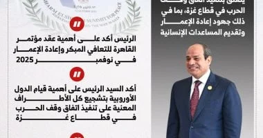 أشار الرئيس إلى أهمية عقد مؤتمر القاهرة للتعافي المبكر وإعادة الإعمار في نوفمبر 2025، واستثمار الزخم الذي ولّدته قمة شرم الشيخ للسلام. وأكد أن مصر والأردن يقودان تدريب عدد من أفراد الشرطة الفلسطينية، وأن دعم الدول الأوروبية لهذا التدريب ضروري لاستمراره وتوسيعه. وذكر أن الدول الأوروبية عليها أن تبذل جهود إضافية لتشجيع جميع الأطراف المعنية على الالتزام بوقف الحرب وتيسير جهود الإغاثة.